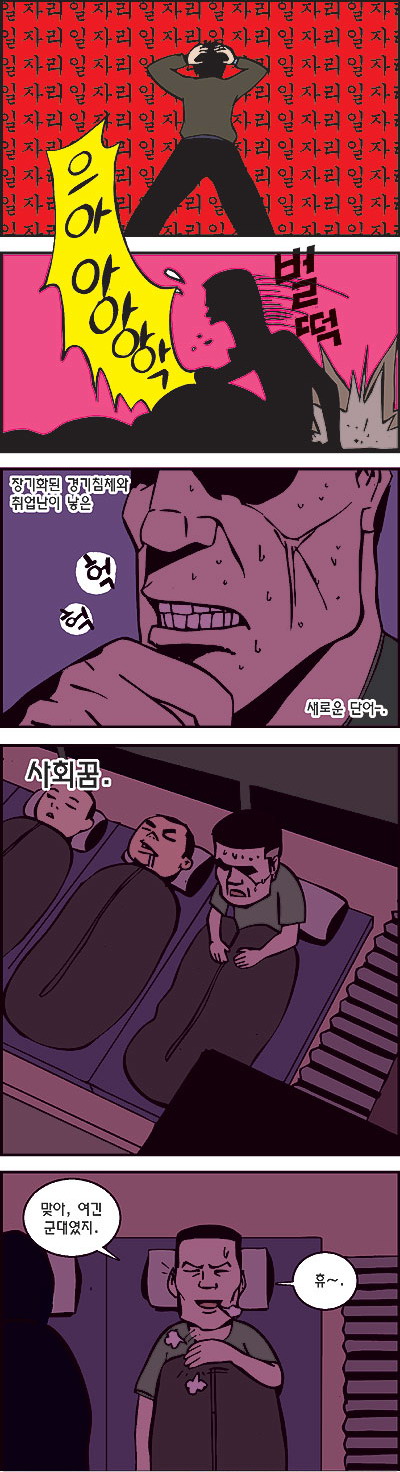 나는 아직도 가끔 군대적 꿈을 꾼다. 하지만 사실 일반적으로 말하는 것과는 다르게 군대시절 추억들이 떠오른다. 이 만화를 보니 예전에 IMF가 터지고 입대 붐이 일었던 것이 생각난다. 거짓은 아닐 것이다. 나 또한 이런 기로에 서있는 사람들 중 하나니까…