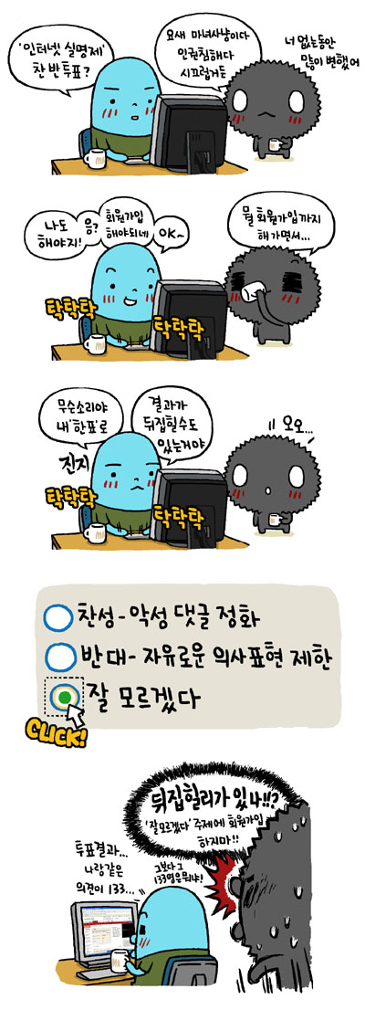 글쎄… 나는 얼마만큼 매사에 확실하게 행동할까? 그렇지만 잘 모르겠다를 눌러본 적은 없는것 같다. 이제와서 생각해 보니 난 저런 투표를 하면 보통 반대를 많이 눌렀던 기억이 난다. 음… 좀 부정적인 경향이 있는 건가? 갑자기 이런저런 생각이 떠오르네…