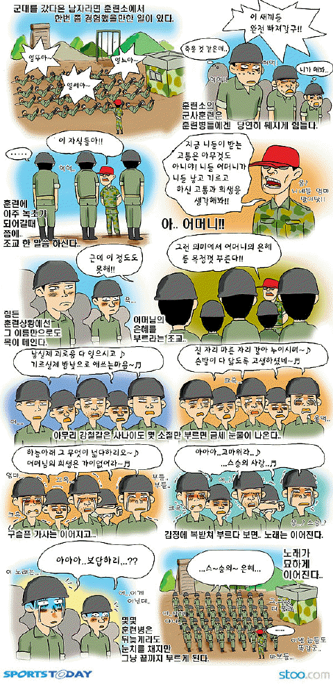 이 만화는 군대를 다녀온 예비역이라면 한번은 겪어봤을 만한 내용의 만화이다. 훈련소 기간중 가장 힘들다는 유격 훈련에서 조교들이 어김없이 ‘어머님의 은혜’를 시키는데… 이 만화와 같은 일이 종종 있다는 것이다.
