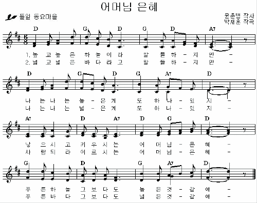 이건 바로 ‘어머님 은혜’라는 곡으로 누구나 아는 노래일 것이다. 뭐 일단 이게 오늘의 주제는 아니니 넘어가도록 하고(한번쯤 집에서 불러보길 바란다). 그럼 저 만화에서 부르고 있는 우리가 ‘어머님의 은혜’라고 알고 있던 곡은 사실 ‘어머니의 마음’이라는 곡이다.