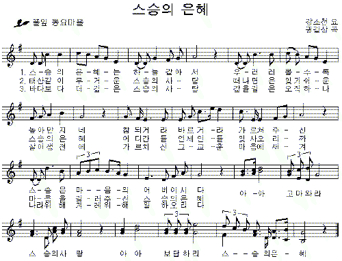 이 노래는 4분의 3박자 바장조(F)의 곡이다. 그럼 왜 우리는 이 노래를 부르다가 중간에 ‘스승의 은혜’로 엉뚱하게 부르는 것인가? 이제 ‘스승의 은혜’ 악보를 보자. 이 노래는 4분의 3박자 사장조(G)의 곡이다. 두 곡은 일단 4분의 3박자로 박자가 동일하다. 그렇기 때문에 노래가 이어질 수 있는거다.(당연한거 아닌가? ㅡㅡㅋ) 암튼…