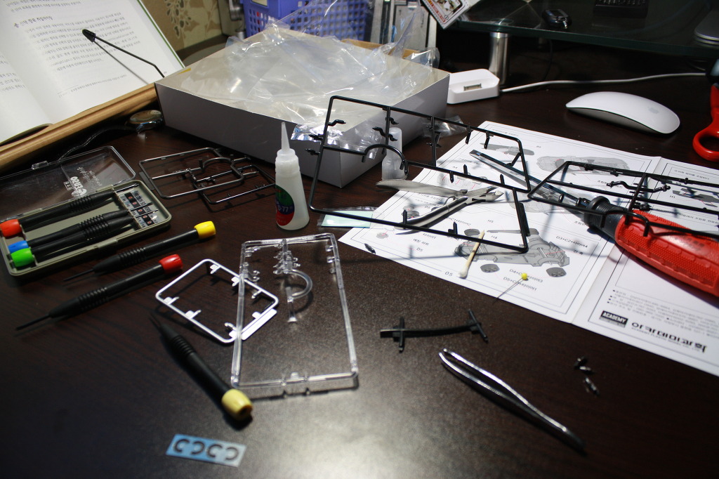 앞서 F14 모델은 간단했는데 의외로 람보르기니는 무척이나 복잡했다. 나는 6천원짜리 프라모델을 조립하면서 이렇게 정교하게까지 구성되어 있는지 몰랐다. 니퍼에서 본드, 드라이버, 족집게, 면봉까지 총 동원해서 1시간 씨름 끝에 완성했다.