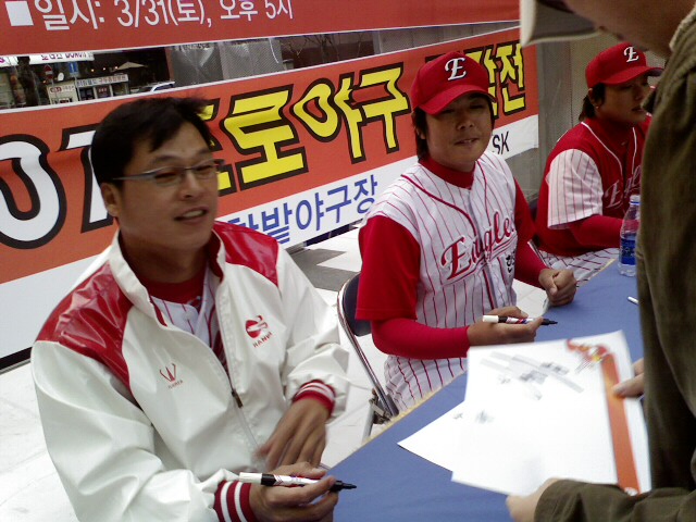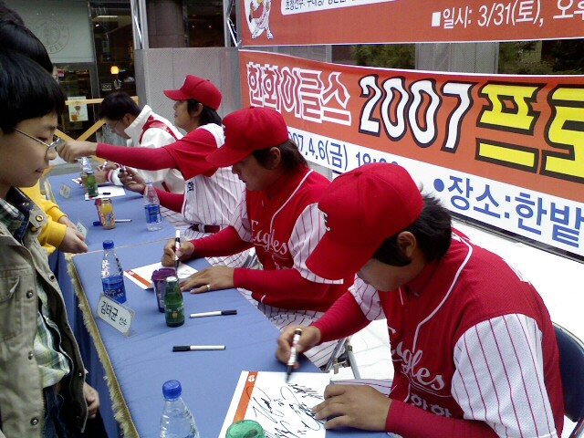 뭐 한화팬은 아니었지만… (삼성 팬이다 -_-a) 혹시 누가 팬사인회에 참석했나 싶어서 기웃거렸더니 유명한 선수들만 와 있었다. 구대성, 정민철, 김태균, 류현진… 김태균을 제외하면 나머지 세 선수가 투수인 것을 보면 한화가 확실히 투수력이 막강한 스타들을 보유하고 있다는 것을 알 수 있었다. 야구 팬이라면 다들 아시겠지만… ;;